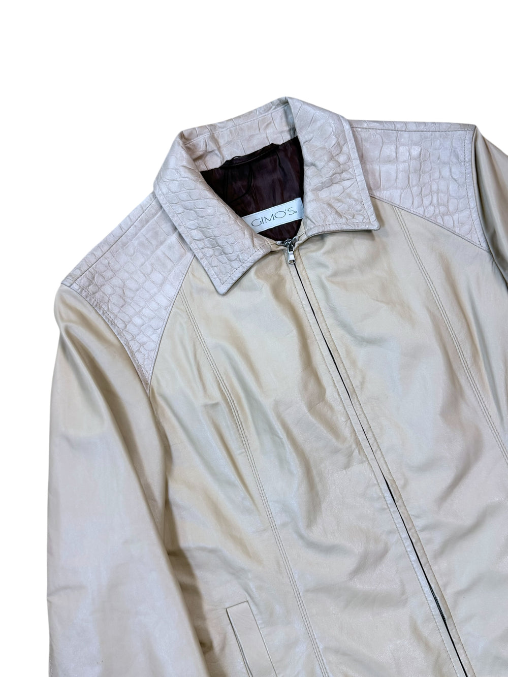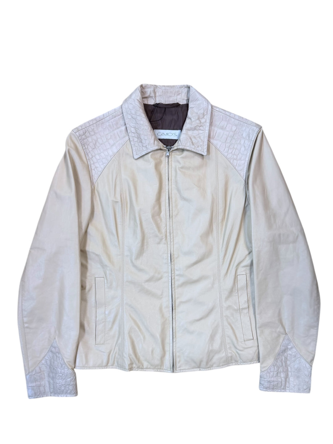 Gimo’s cream leather jacket with crocodile embossed details