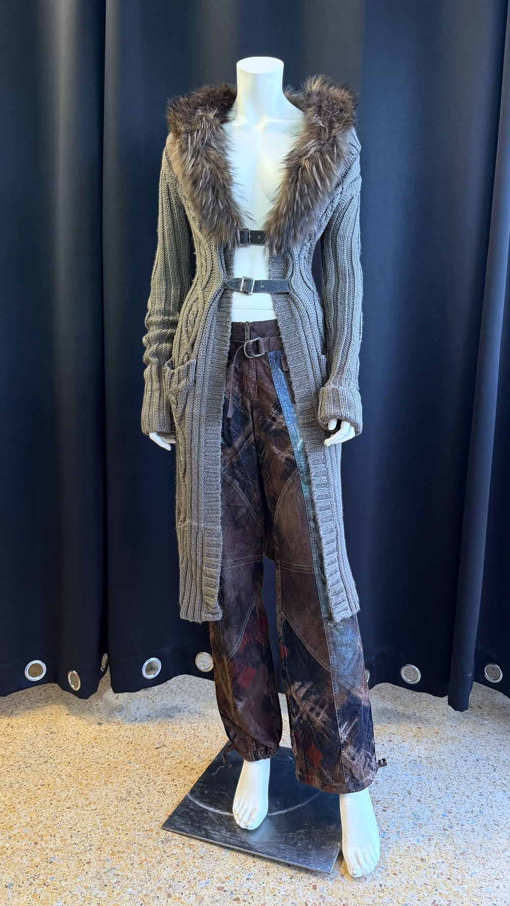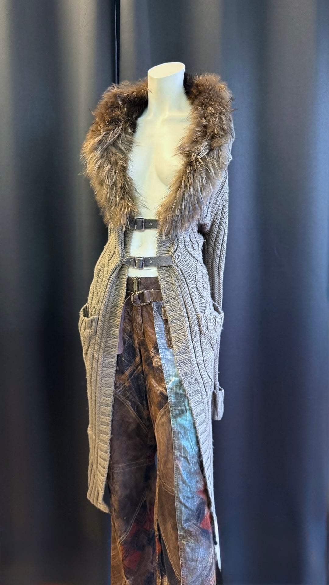 Vintage long knitted coat with faux fur collar