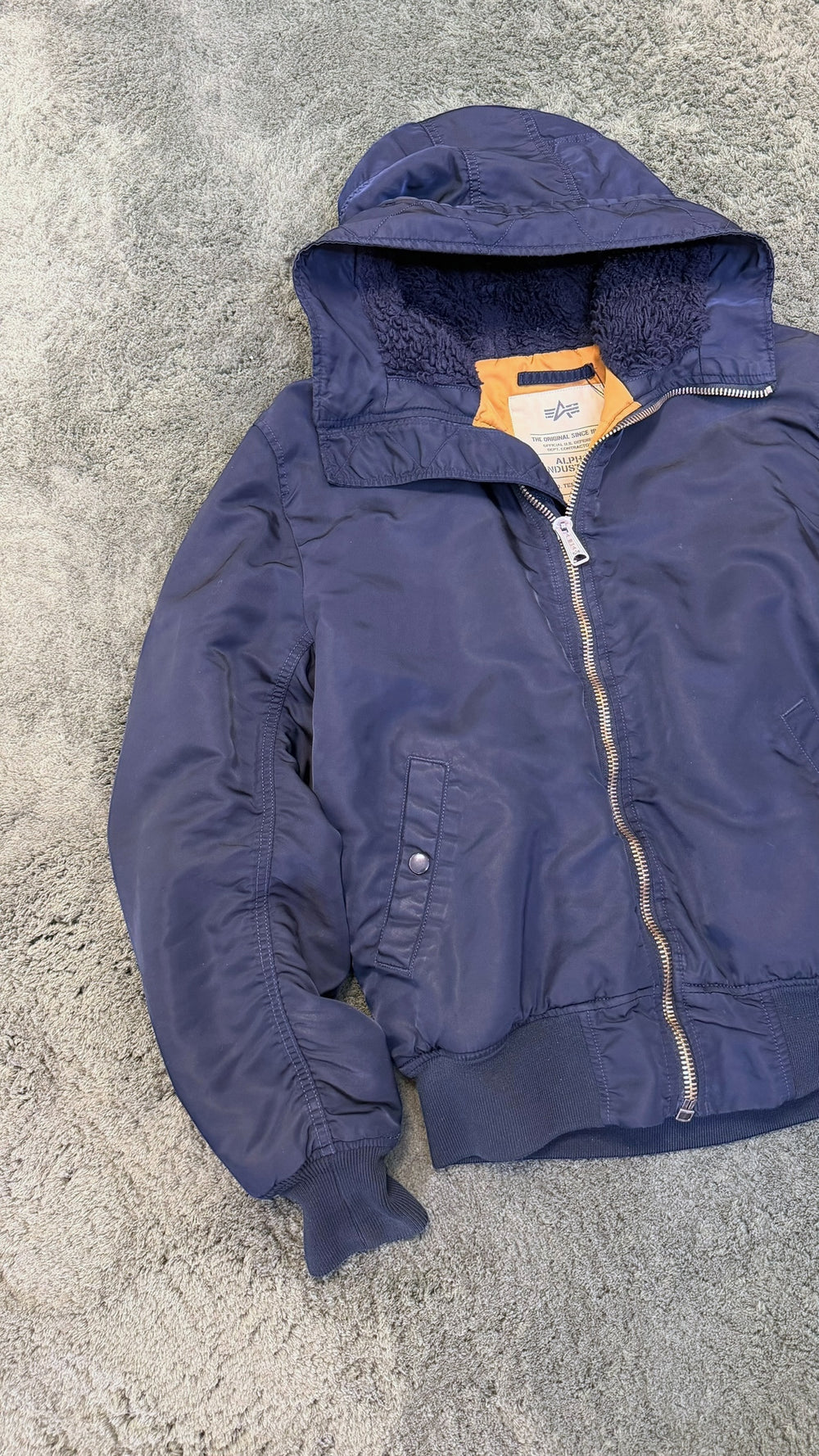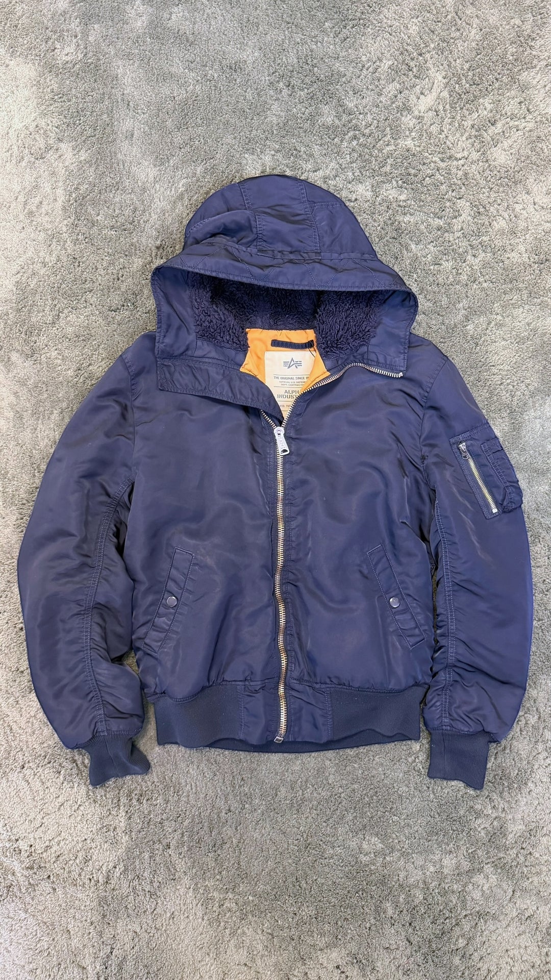 Alpha Industries navy hooded bomber jacket large