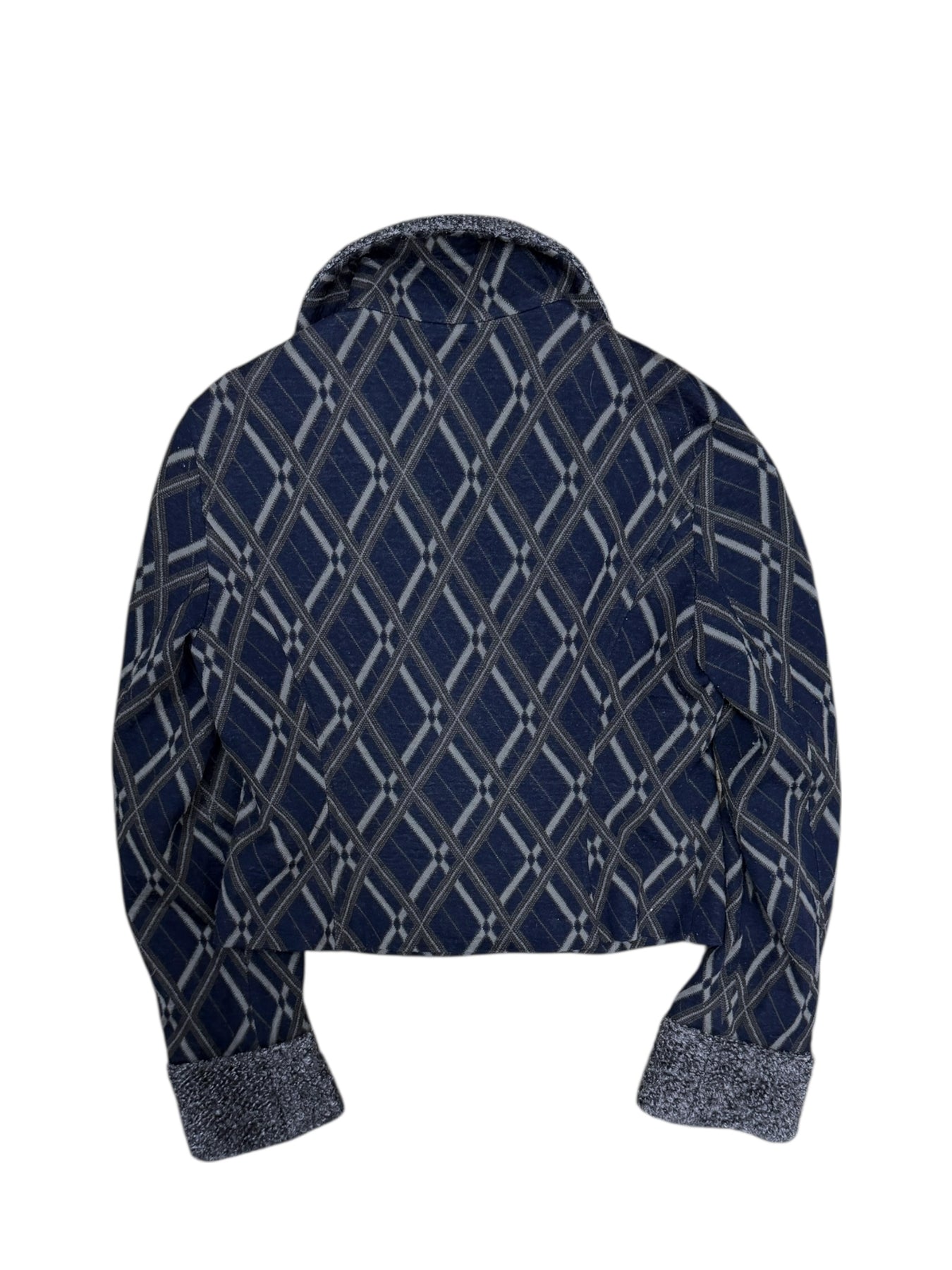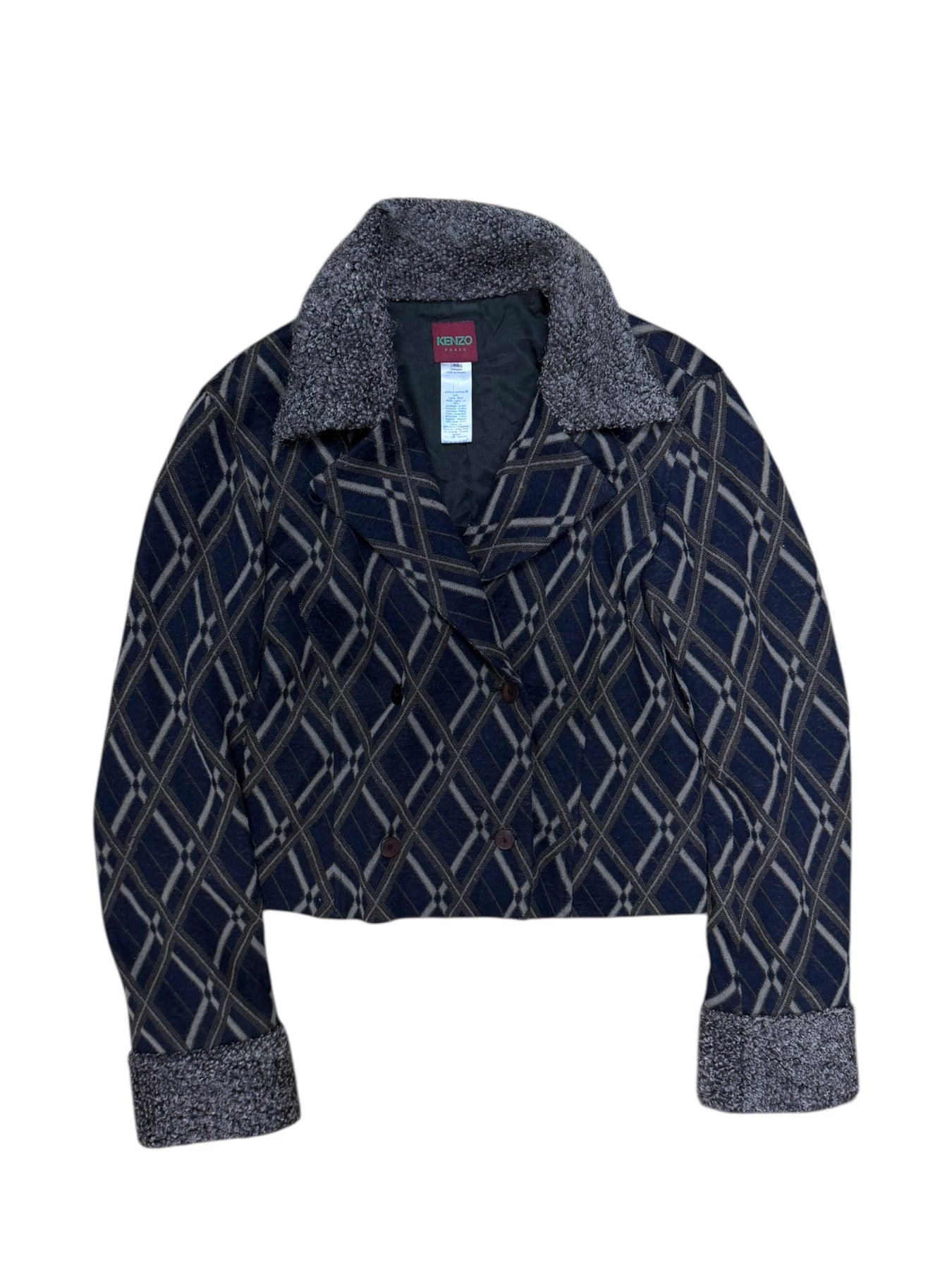 Made in France Kenzo Paris jacket from the 1990s, crafted in a wool acrylic blend with geometric plaid pattern and boucle-textured collar and cuffs. Cropped silhouette with double breasted button closure and soft satin lining. An elegant yet structured piece that perfectly embodies Kenzo’s artistic tailoring and refined Parisian flair.