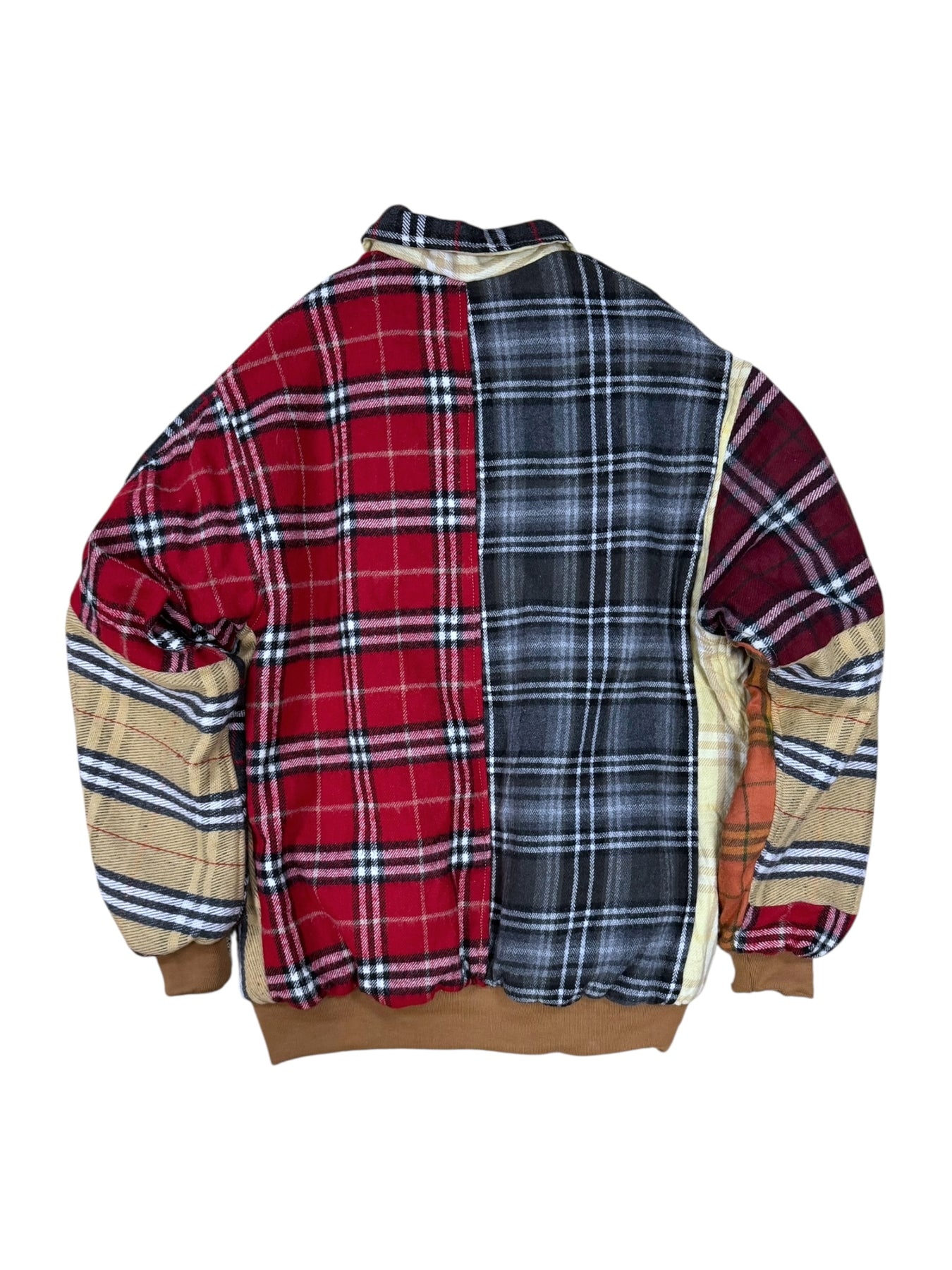 Crafted from multiple vintage check flannels in warm autumnal tones — beige, rust, burgundy, and navy — creating a unique collage pattern.