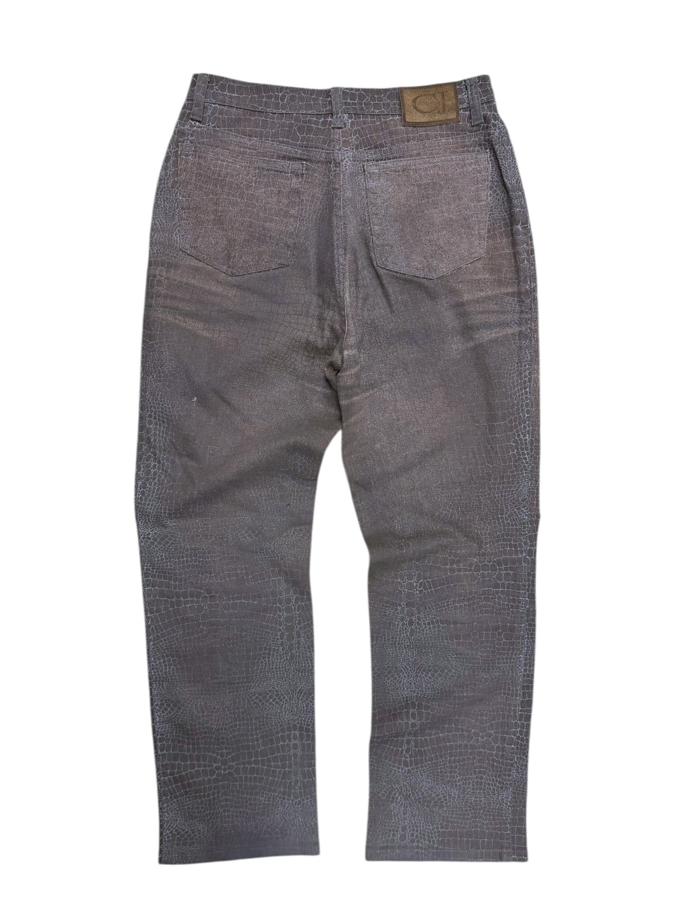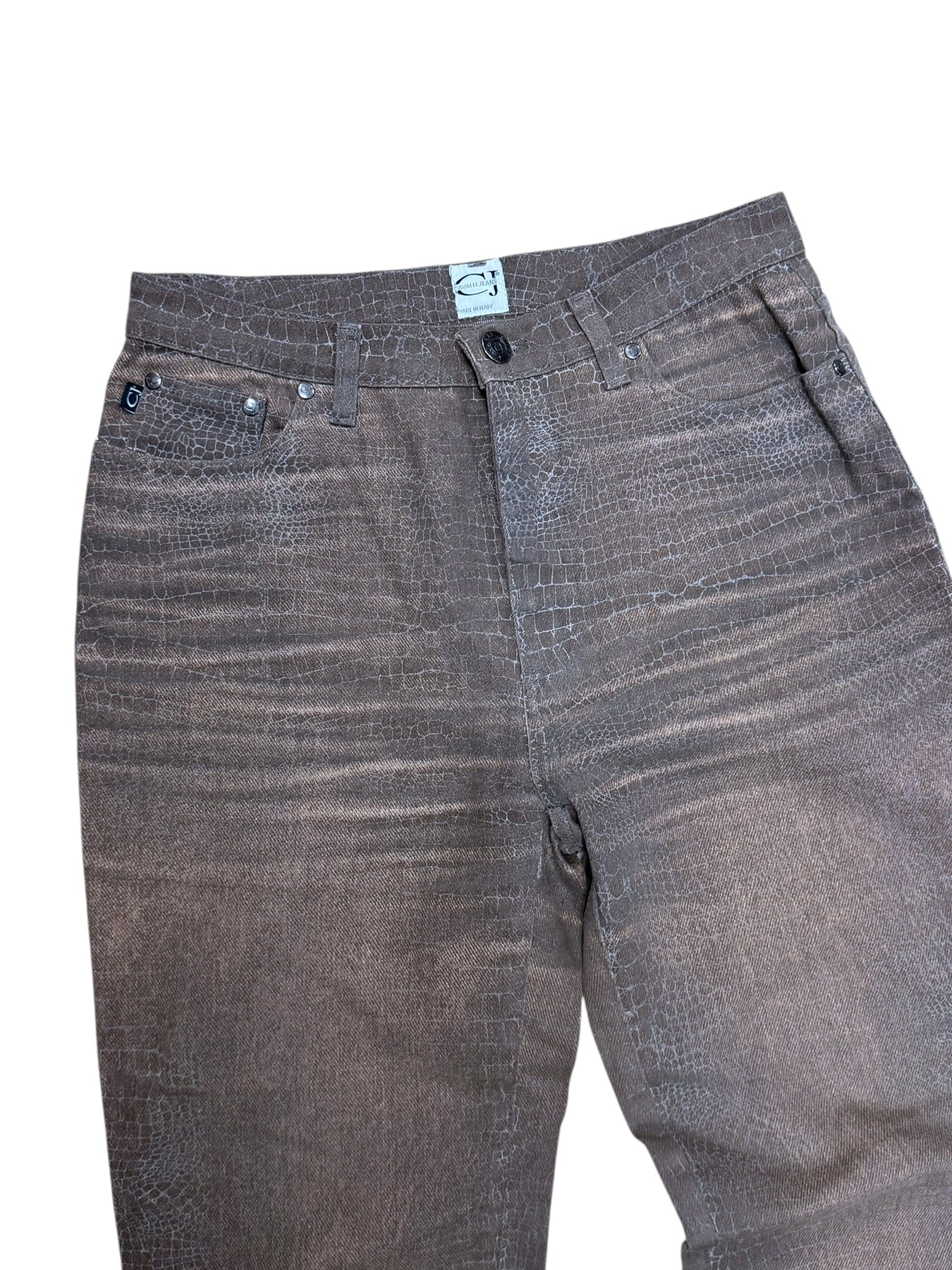 Archive Cavalli Jeans featuring a full crocodile-skin effect print in warm brown tones. Made in Italy from stretch denim with subtle fading across the thighs, this piece embodies early 2000s Cavalli sensuality and texture experimentation.