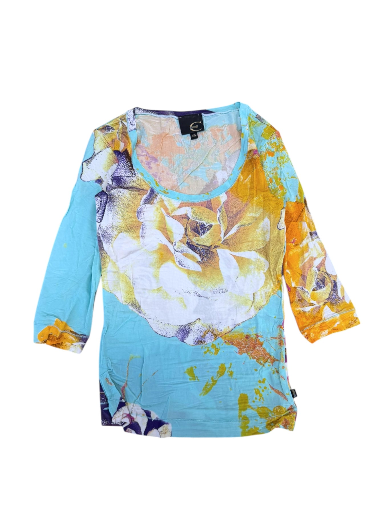 Just Cavalli 2000s top with a vibrant multicolor floral and splash print, 3/4 sleeves and lightweight stretch fabric. Iconic Cavalli graphic style in a bright Y2K color palette. Made in Italy.