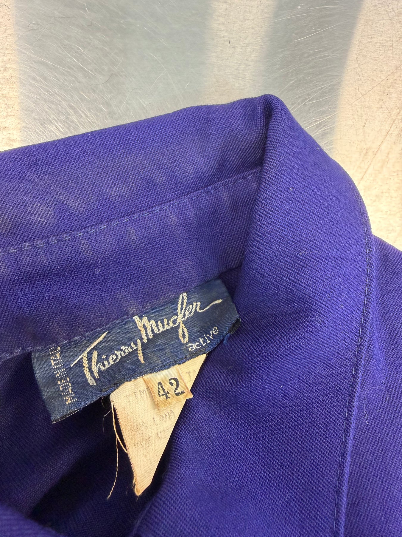 A deep purple button-down shirt dress featuring Mugler’s signature strong bodice construction, pointed collar and sculpted waistline that follows the body’s shape.