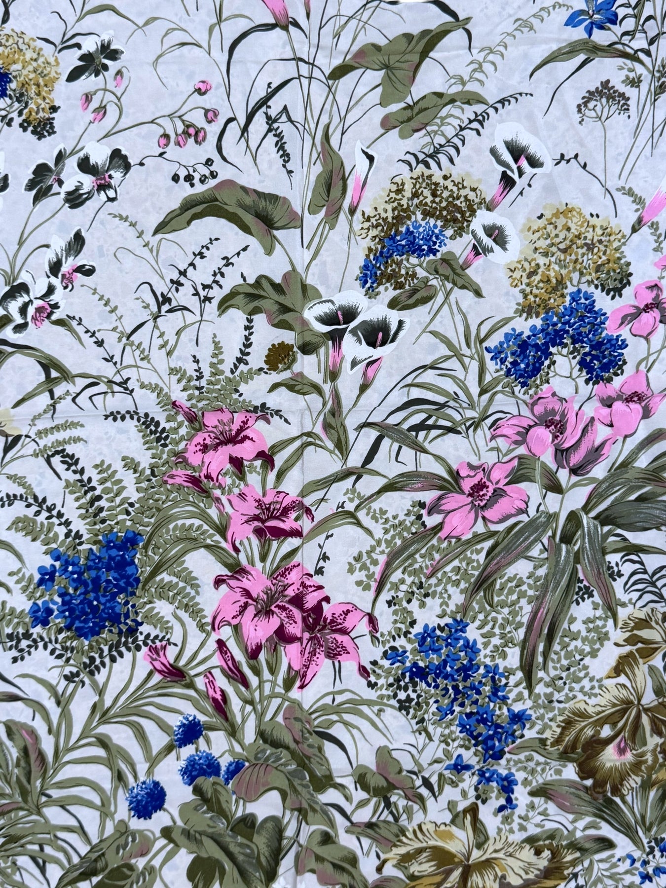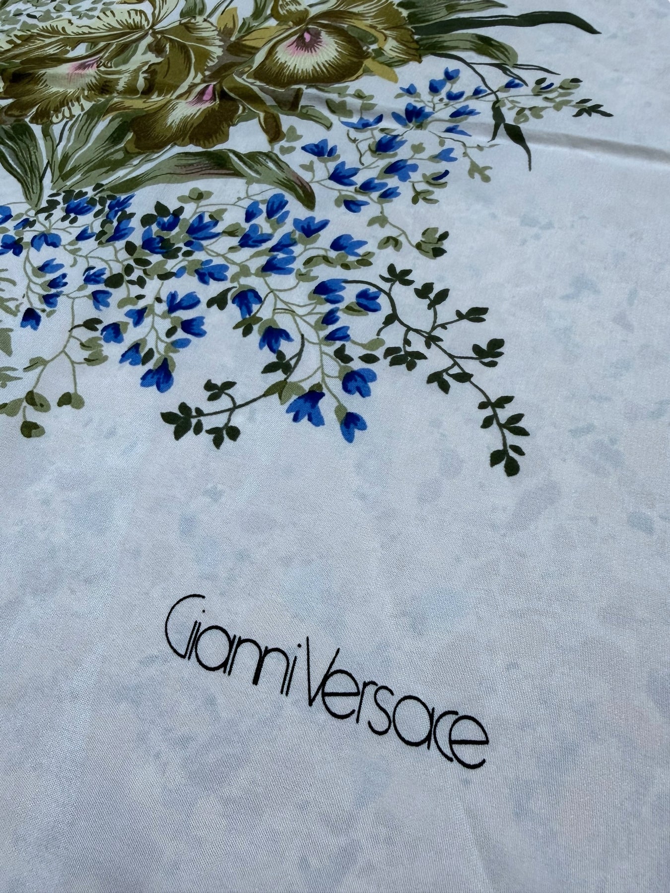 Vintage silk scarf by Gianni Versace showcasing an intricate botanical print with pink lilies, blue irises, and olive-green foliage against a soft white background. Elegant and refined, this design embodies the natural romanticism and detailed craftsmanship characteristic of early Versace accessories.