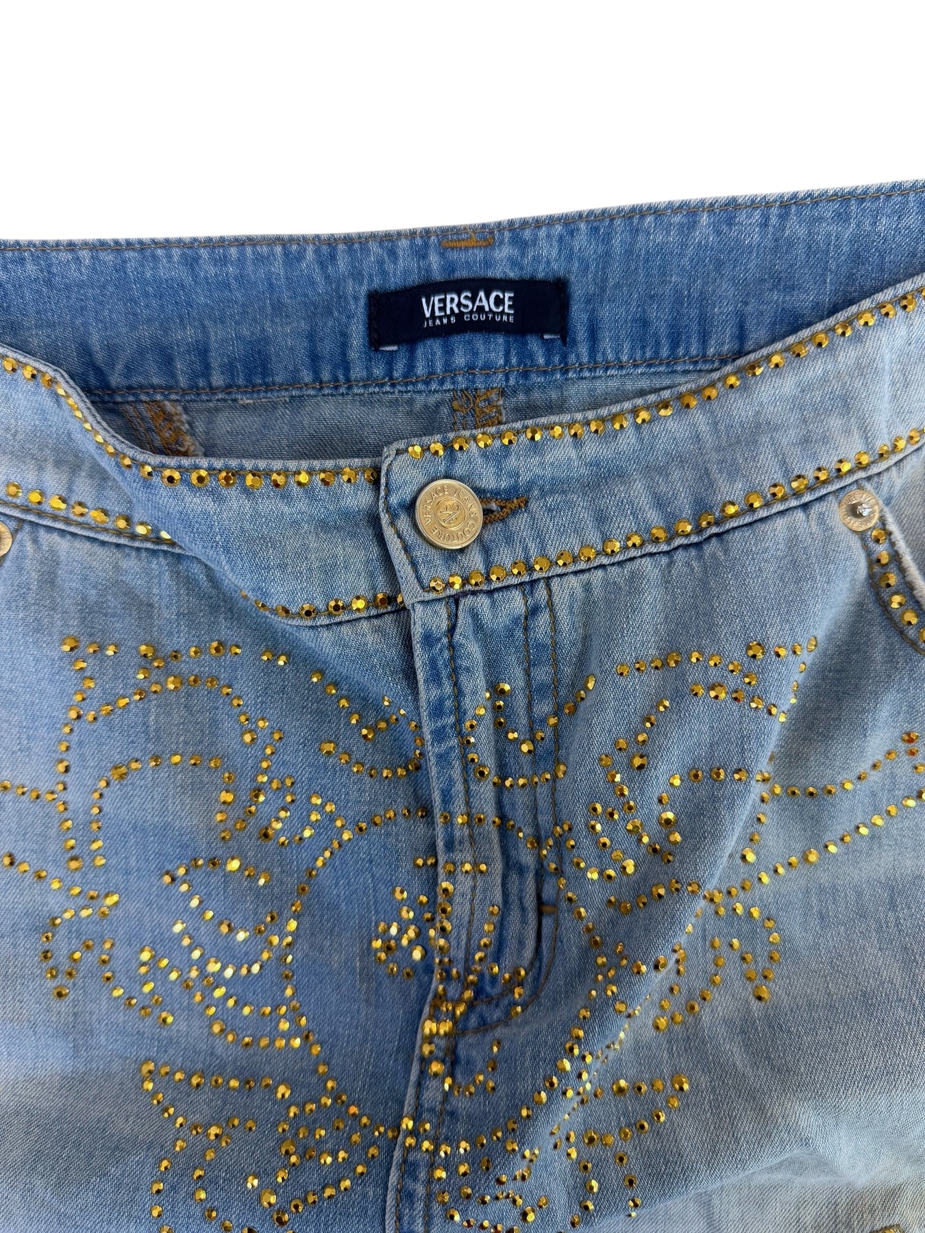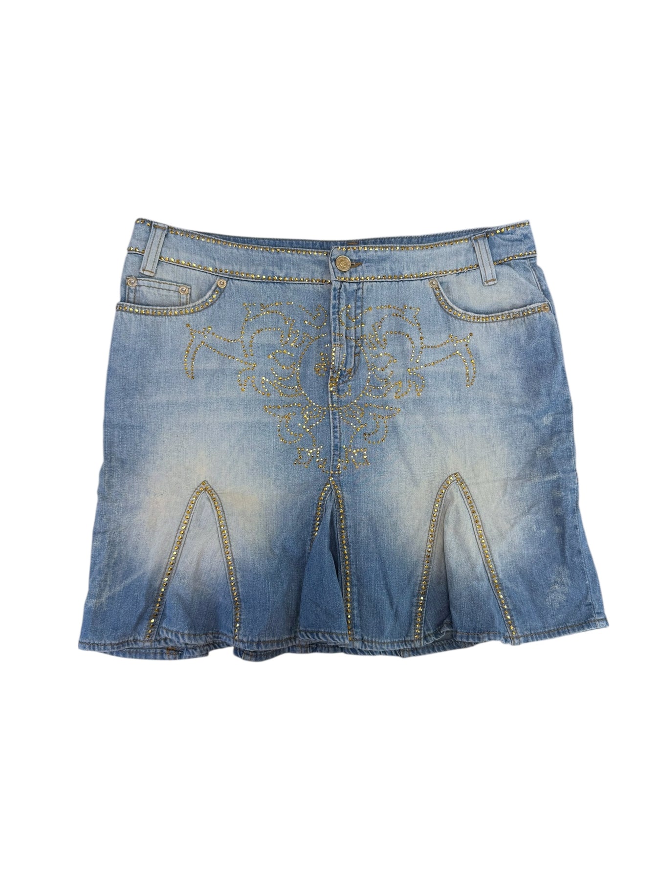 Light blue denim mini skirt with gold rhinestone baroque detailing, flared panel construction, mid-rise waist, iconic early 2000s VJC aesthetic. Made in Italy.