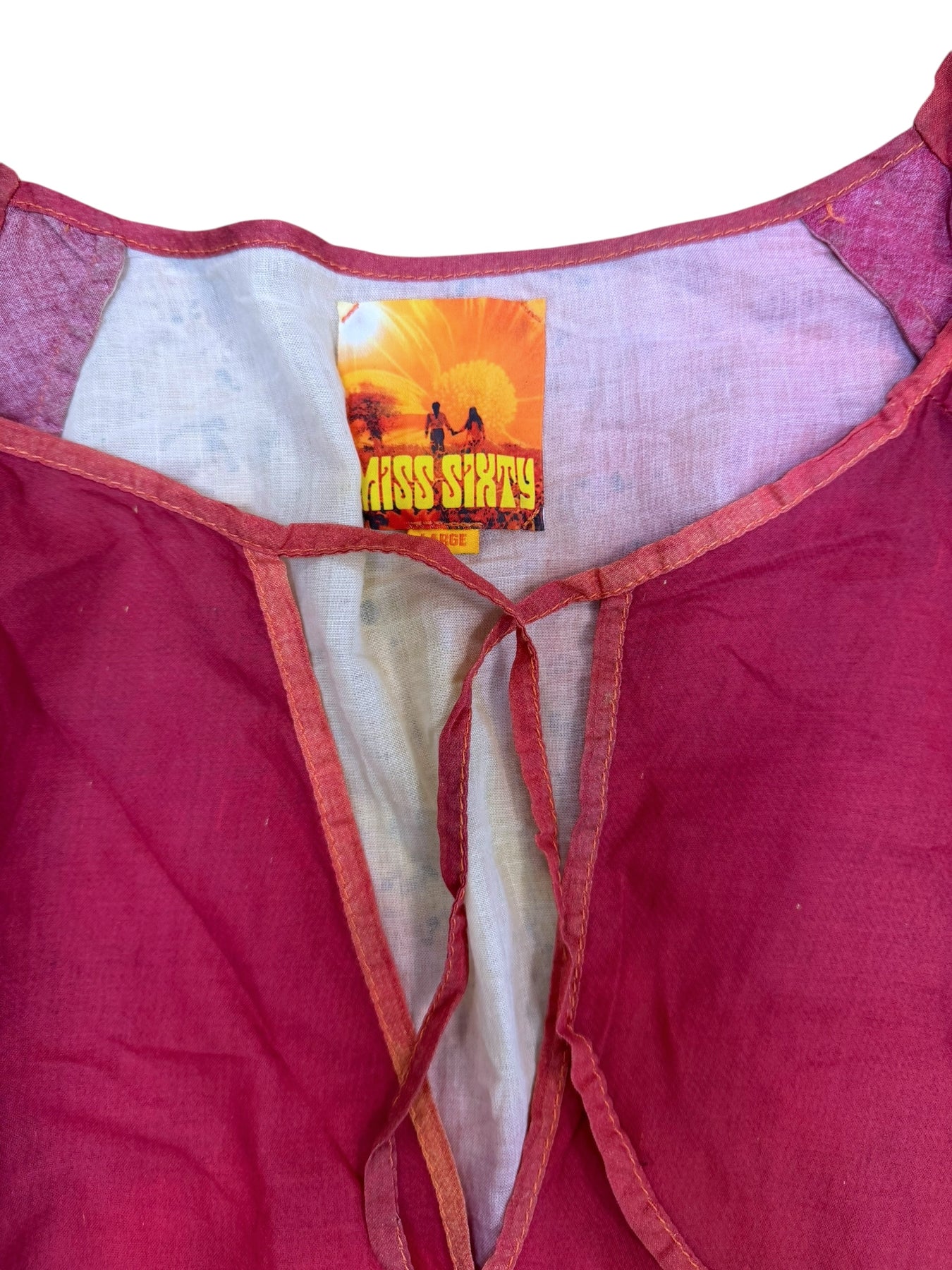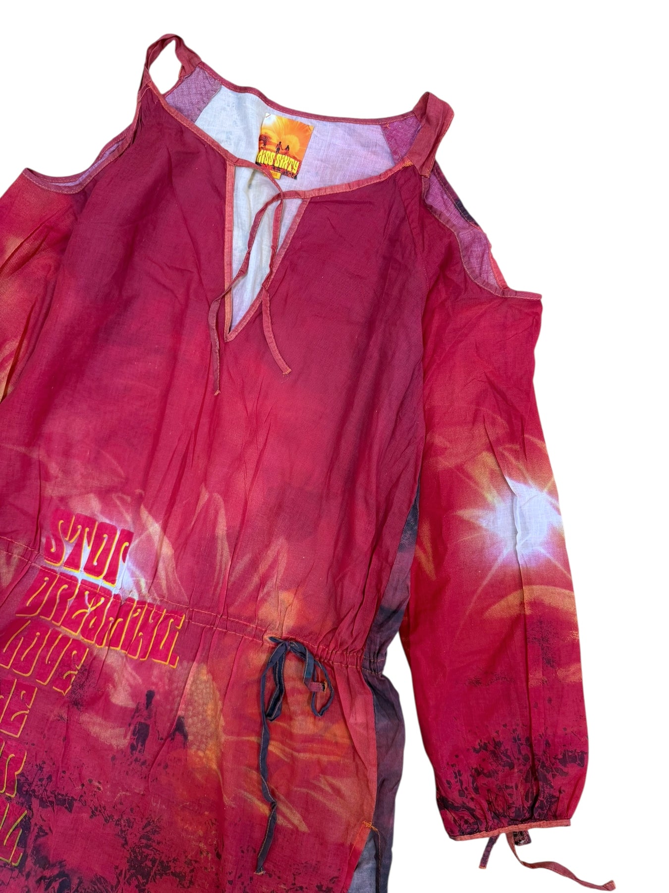 Early 2000s Miss Sixty cotton dress with psychedelic sunset print, graphic slogans, and adjustable waist drawstring. Lightweight fabric, cold-shoulder cut, and iconic Y2K aesthetic.
