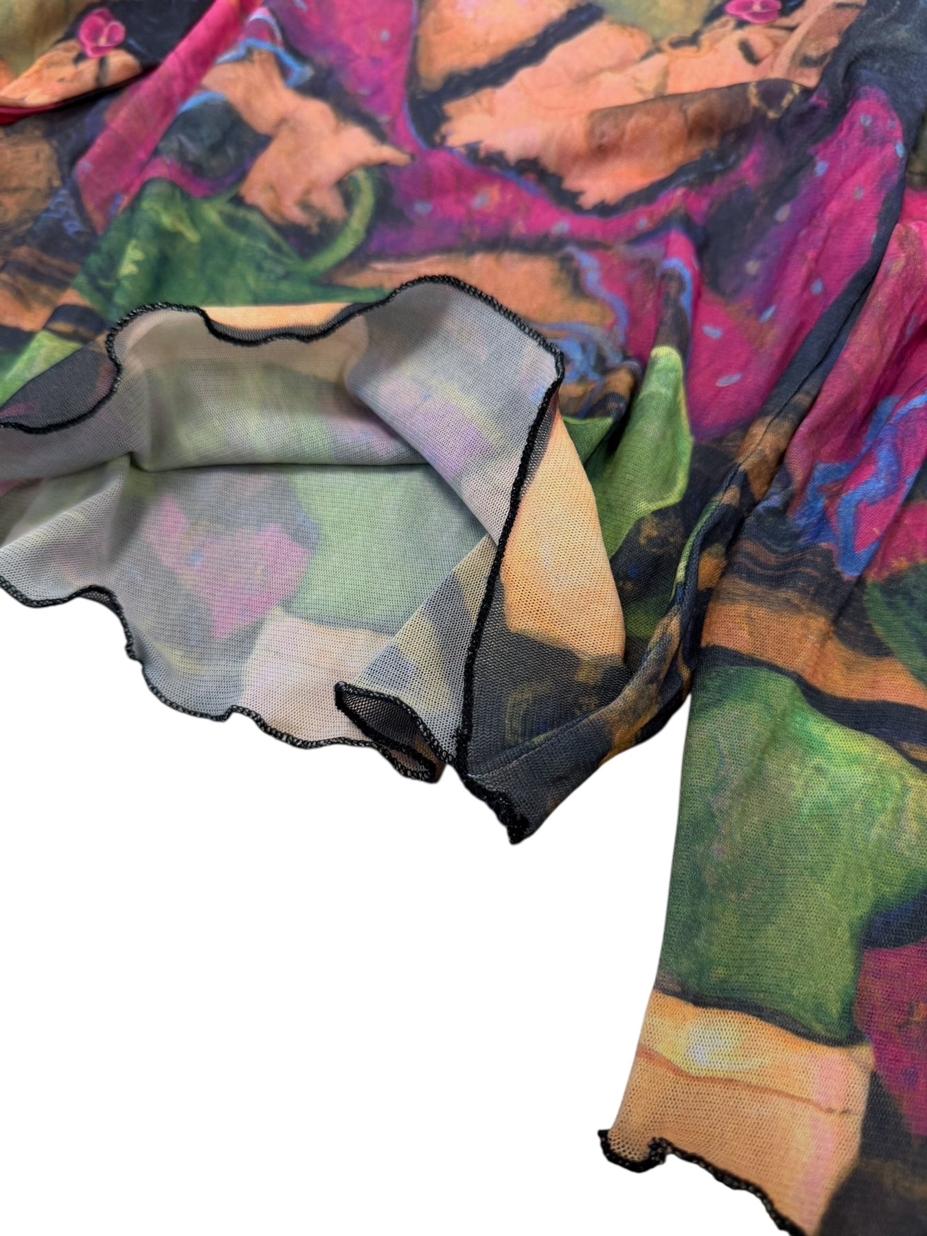 Sheer printed top featuring vivid surrealist artwork and lightweight mesh texture.